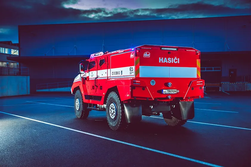 TRITON is a command-reconnaissance vehicle for use in difficult terrain conditions and in high-risk environments. It is therefore suitable for use against fires with risk of explosion in areas with hazardous or explosive material and ammunition, for accidents in chemical plants, in areas contaminated with toxic substances or, for example, in natural disasters or forest fires or during removing the consequences of terrorist attacks. TRITON will be used as the first deployment vehicle in demanding conditions. TRITON provides the crew with a high level of ballistic (level 2) and explosion protection (level 2a / 2b), with an operating weight of 15 095 kg, a total of 18 000 kg.